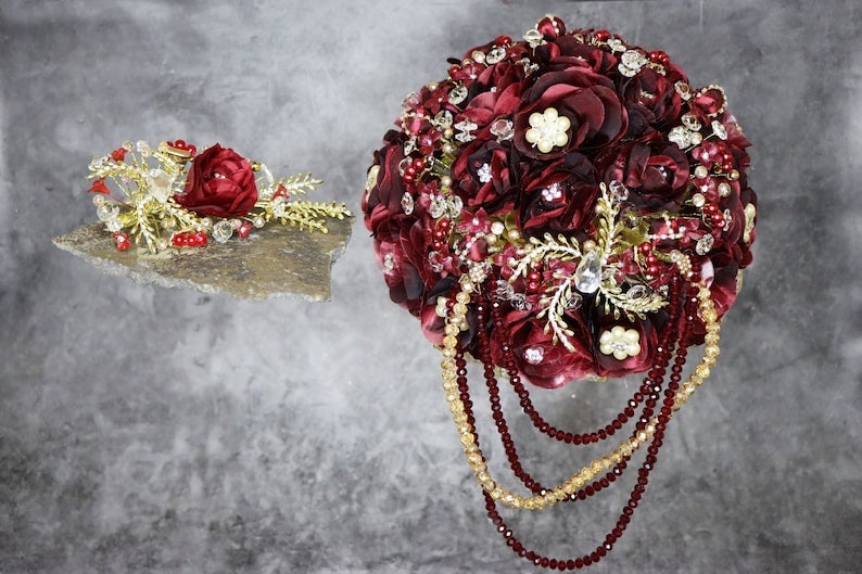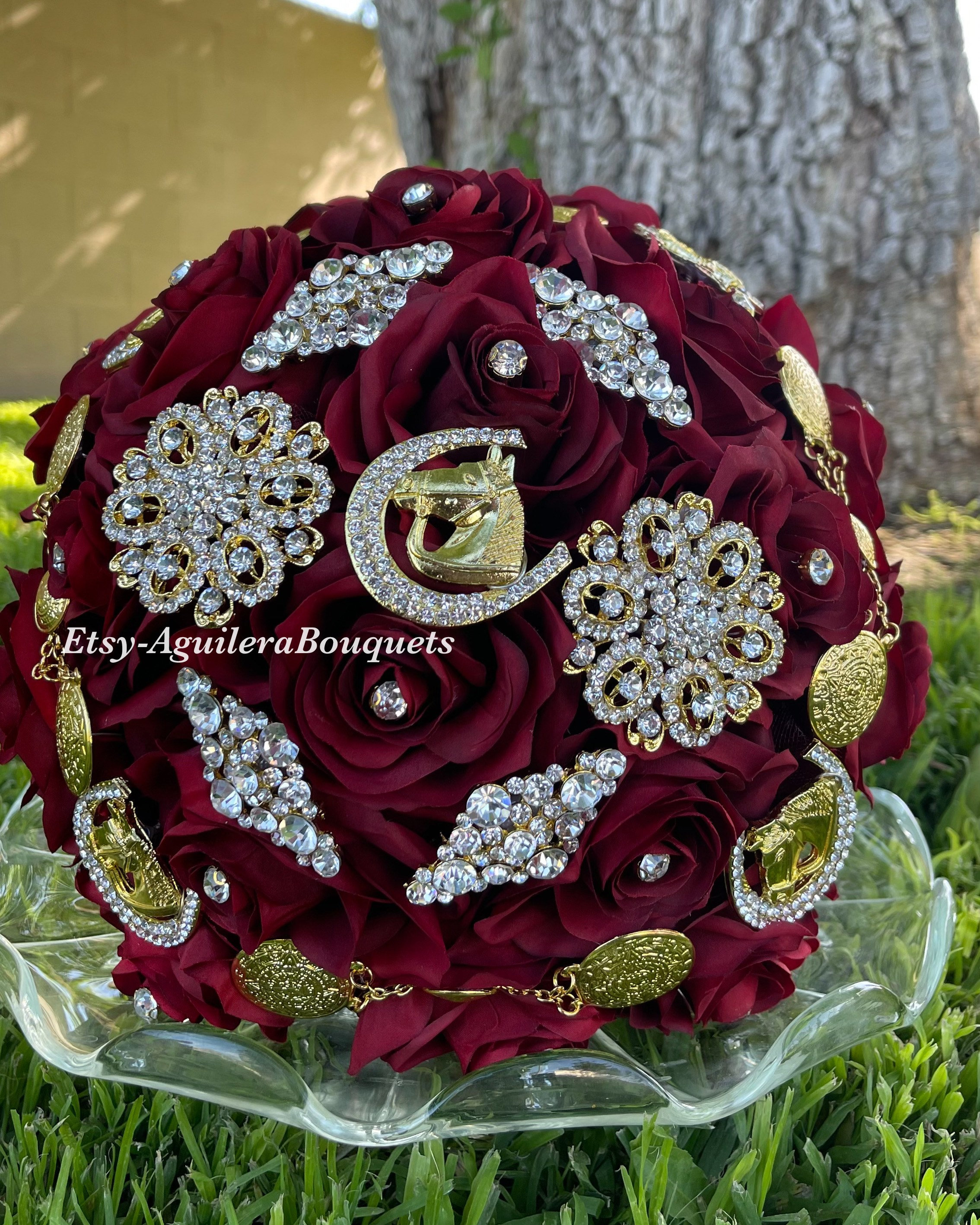 Burgundy And Gold Quinceanera Flower Bouquet Ramo De Quinceanera